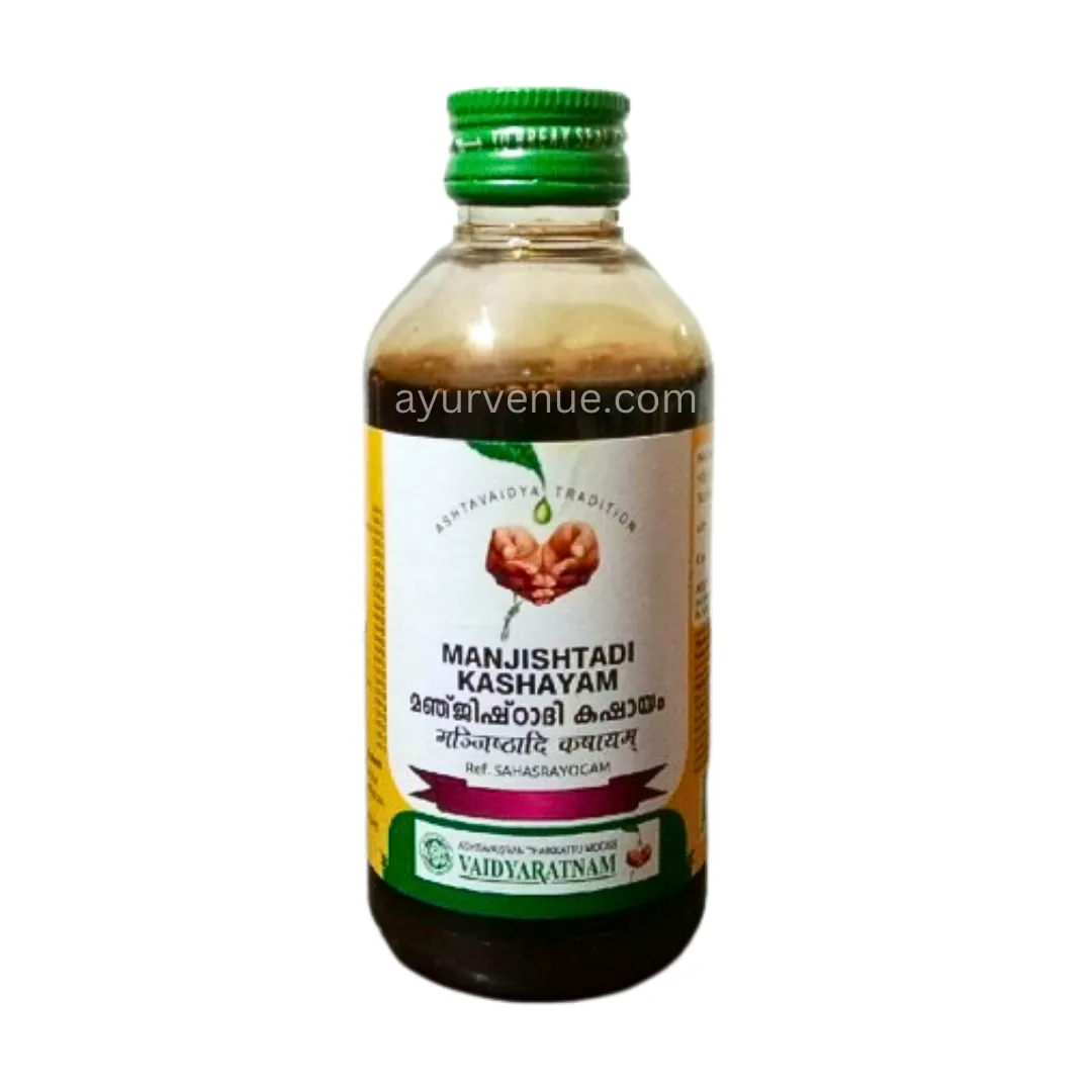 Manjishtadi Kashayam is a classical Ayurvedic herbal decoction prepared with ingredients like manjishta, neem, and turmeric, known for their skin-nourishing and detoxifying properties. This herbal decoction supports skin health, aids in detoxification, and promotes overall well-being when taken as directed by a healthcare practitioner.